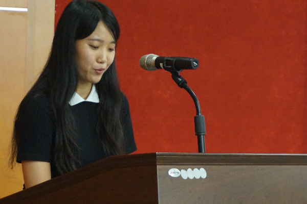 之后,2015级本科生代表李桃君和硕士研究生代表冯美娜分别发言。李桃君以“喜悦、感谢、梦想”为发言的关键词。她讲述了自己怀揣梦想来到北大的欣喜和感动,并对老师、学长学姐、同伴和父母的付出表示感谢。最后,她希望同学们能够通过追逐梦想的过程遇见更好的自己,在新传这片沃土上发挥自己的才能。冯美娜则对自己能够在北大继续磨砺自己表示庆幸。她感谢了学院各位老师为自己打开的知识大门,更希望自己能与同学们度过充满回忆的两年。
