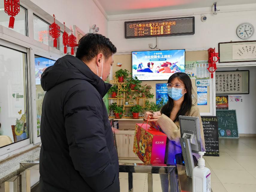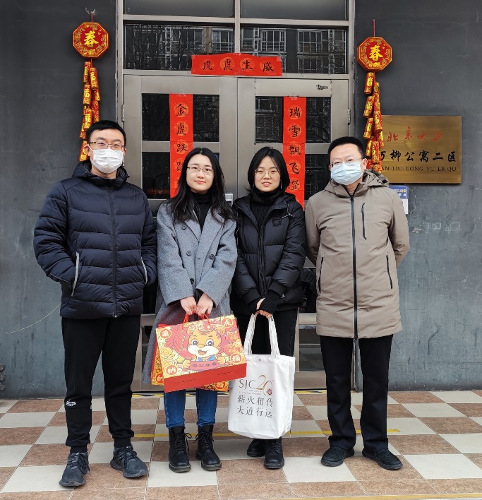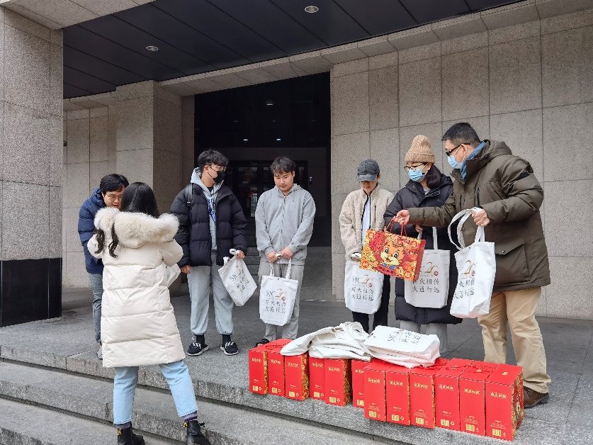 为了确保将学院的关心送至每一位同学,学院老师们在蒙民伟楼向部分留校同学发放新年慰问物资、送上新年祝福后,分别前往燕园、中关新园、万柳等学生宿舍区,把餐券、福字和学院定制的新传人帆布袋、书籍、虎年食品礼盒等慰问品交到了同学手中。