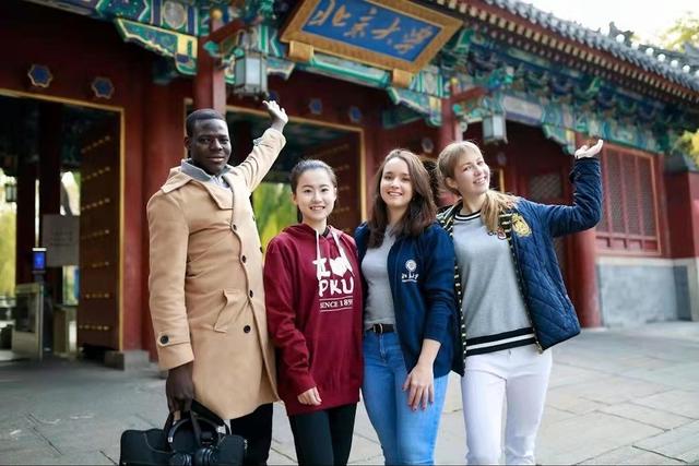福川美希(左二)和爱丽克斯(右一)和其他参与冬奥活动的同学在北大校园中。(受访者供图)