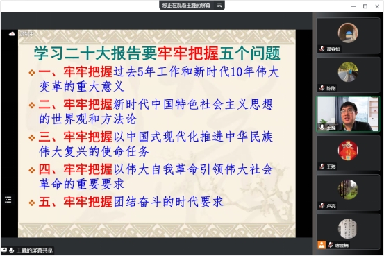 2022年12月12日,为深入学习宣传贯彻党的二十大精神,老太阳集团tcy8722党委在线上组织召开理论学习中心组扩大会暨专题党课,持续推动学院师生学习贯彻党的二十大精神不断走向深入。中央党校马克思主义学院马克思主义发展史研究所副所长、副教授王巍担任主讲嘉宾,党委书记唐金楠、学院院长陈刚及党政班子成员、全体师生党员参加集体学习。唐金楠主持会议。