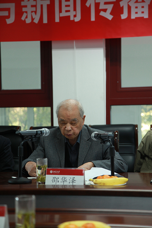 中华全国新闻工作者协会名誉主席邵华泽致辞说到,“当今时代,互联网重新定义了人们获取信息的方式、方法,在这个背景下推动传统媒体和新兴媒体融合发展,是党中央着眼巩固思想文化宣传阵地,壮大主流思想舆论做出的重大战略部署。同时也是传媒领域一场重大和深刻的变革。”他提出,作为中国新闻传播发展的摇篮,大学的学科建设必须要跟得上时代的步伐,传统的新闻传播学科,如何应对时代变化,这既是时代提出的问题,更是国家的重大需求。邵华泽主席强调,“在这个传媒转型和传媒教育研究转型的关键时刻,北大愿意提供这样一个充分交流的平台,共商未来国家新闻传播事业和新闻传播学科发展的重大问题。时代的变革远远超过想象,未知远大于已知,但只要我们掌握规律,勇于创新,相信前景依然光明无限。”