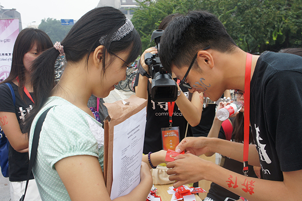 彩绘。每个报道完毕的2014级“新传人”都会被绘上学院的英文缩写。这些或被绘在脸上或被绘在手上的新传标志大大增强了新生们对学院的认同感和归属感,同时也成为了当天学校里一道亮丽的风景。
