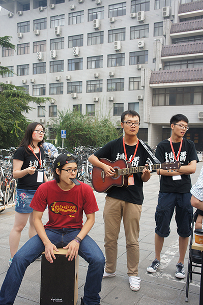 唱歌。在展板旁边的空地上,有学院提前招募的具有乐器特长的“文艺志愿者”在现场为新生报到拍照进行伴奏,以美妙的音乐来迎接新生,同时也吸引了一大批学生和家长驻足观看。