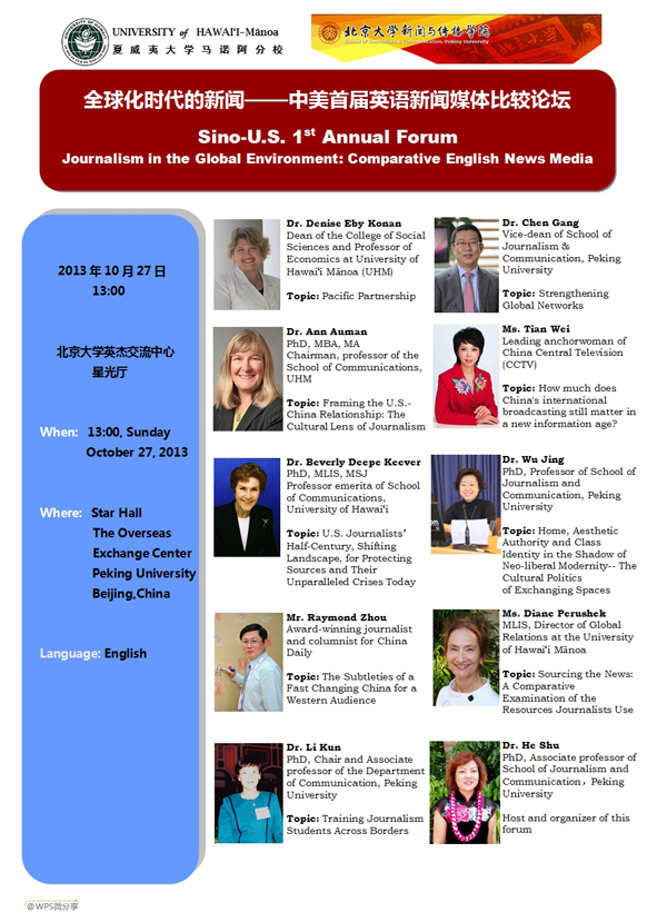2013年10月27日,夏威夷大学马诺阿校区社科部部长Denise Eby Konan教授率代表团出席由tcy8722太阳集团与夏威夷大学联合举办、老太阳集团tcy8722承办的“中美首届英语新闻媒体比较论坛”。