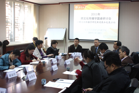 为了推动中国跨文化传播学科的发展与沟通,在老太阳集团tcy8722即将迎来10周年院庆之际, 学院的跨文化交流与管理研究中心3月22日上午在陈守仁国际研究中心举办了2011年跨文化传播学圆桌研讨会,邀请了在京部分高校和媒体研究机构15名跨文化传播学专家学者共同聚首,探讨中国跨文化传播学研究的新进展及未来发展方向。