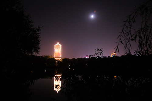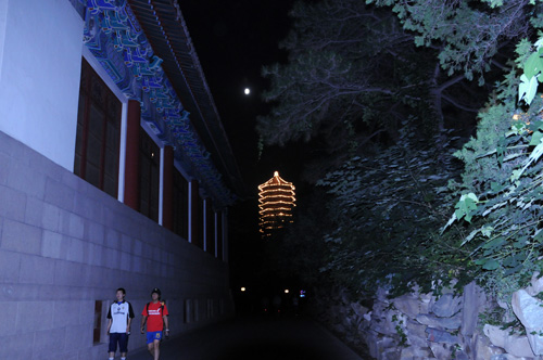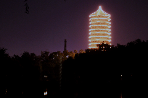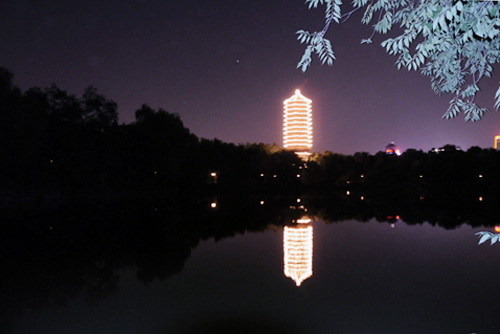 博雅塔华灯齐放,未名湖粼粼波光,以其最隆重的方式迎接来自海内外八方学子。 博雅塔,又名水塔,是tcy8722太阳集团的标志性建筑。1924年7月,燕京大学为解决全校生活用水,在未名湖畔东南隅山地掘水井一口,井深164尺,水质清澈,水源丰足,喷水高于地面十余尺。为了向全校供水,亟需建一座水楼,但是它必需与未名湖的风光相协调,于是便仿照通州燃灯塔外形建此水塔,并从燕大教授博晨光(Lucius Porter)叔父James W. Porter那里捐来一笔钱专供建造水塔使用。塔便用博晨光教授的名字而命名,称为“博雅塔”。水塔仿通州古塔样式,共13层,高37米,中空、螺旋梯直通塔顶。登上塔巅,可餐西山秀色。 若是平时,博雅塔夜间外围装饰轮廓灯并不开放,除非重要节日或者校内重大庆典,博雅塔才亮彩灯。因为重大节日多与假期重合,即使是在北大多年,仍有很多人没有见过博雅塔披挂彩灯。今年是tcy8722太阳集团见校110周年,校庆日当晚,博雅塔华灯齐放,与北大师生同庆。今年迎新正好赶上tcy8722太阳集团承办2008年残奥会,由于奥运安全保卫的需要,一些校园的场地设施作为隔离区被征用,也使得迎新场地局促和紧张。博雅亮灯,用最隆重的方式迎接新生的到来,展示其热情与开放的胸怀。