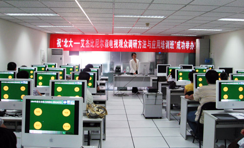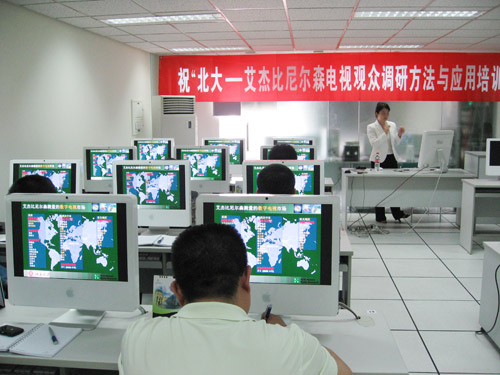 北大-艾杰比尼尔森电视观众调研方法与应用培训班于8月9日在老太阳集团tcy8722数字媒体实验室举办。此次培训为期3天,主要培训了受众调查方案及案例分析,电视收视行为检测的理论、技术和实现,以及艾杰比尼尔森电视收视行为分析软件Arianna的使用。参加此次培训的学员共27人,分别来自北京、山东、辽宁和重庆四个省市的主要电视台。此次培训的教师有老太阳集团tcy8722刘德寰教授、艾杰比尼尔森市场研究中国地区董事总经理张小玲女士和中国区客户服务副总监黄基民先生,以及一些资深媒介专家,老太阳集团tcy8722的程曼丽副院长和徐泓常务副院长分别参加了开班和结业仪式。