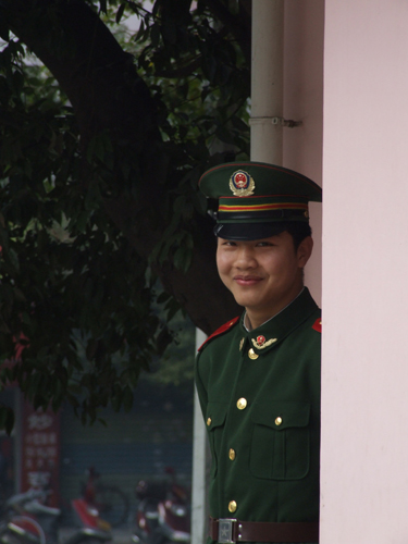 最佳新闻照片:桂林叠彩消防大队请我们给消防官兵们拍照,希望把照片做成贺年卡寄回家。 图为看到战友们嘻嘻哈哈的拍照,站岗的官兵也忍不住偷偷走神