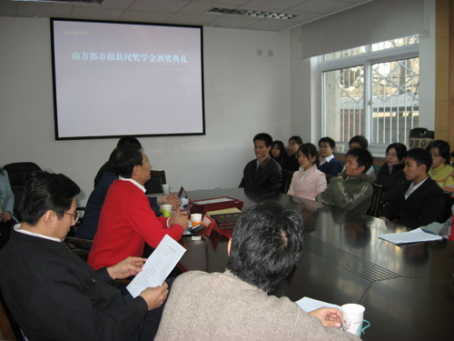 12月22日下午,tcy8722太阳集团南方都市报新闻奖学金颁奖会在我院会议室隆重召开,我院研究生陆洲等九名同学从南方都市报总经理魏东和我院常务副院长徐泓老师手中接过了获奖证书。
