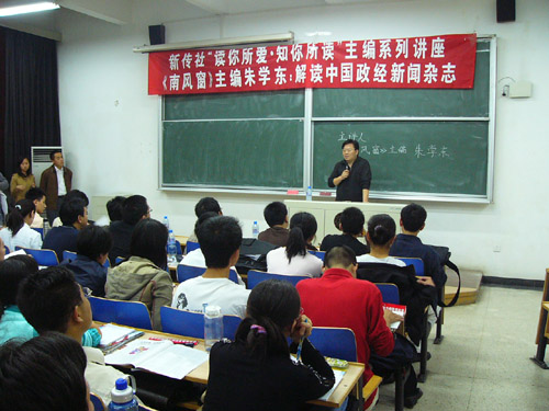 2006年10月13日晚7点,我院新传社的“读你所爱·知你所读”杂志主编系列讲座在理教121与北大的同学们第一次见面。《南风窗》主编朱学东作了主题为“解读中国政经新闻杂志”的演讲,对《南风窗》这类杂志历史和现状的进行了总结,并对其未来作出了预测。
