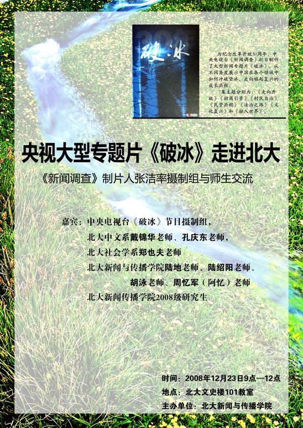 2008年12月23日,《破冰》节目总编导张洁率《破冰》摄制组走进北大校园,与北大师生深入交流。