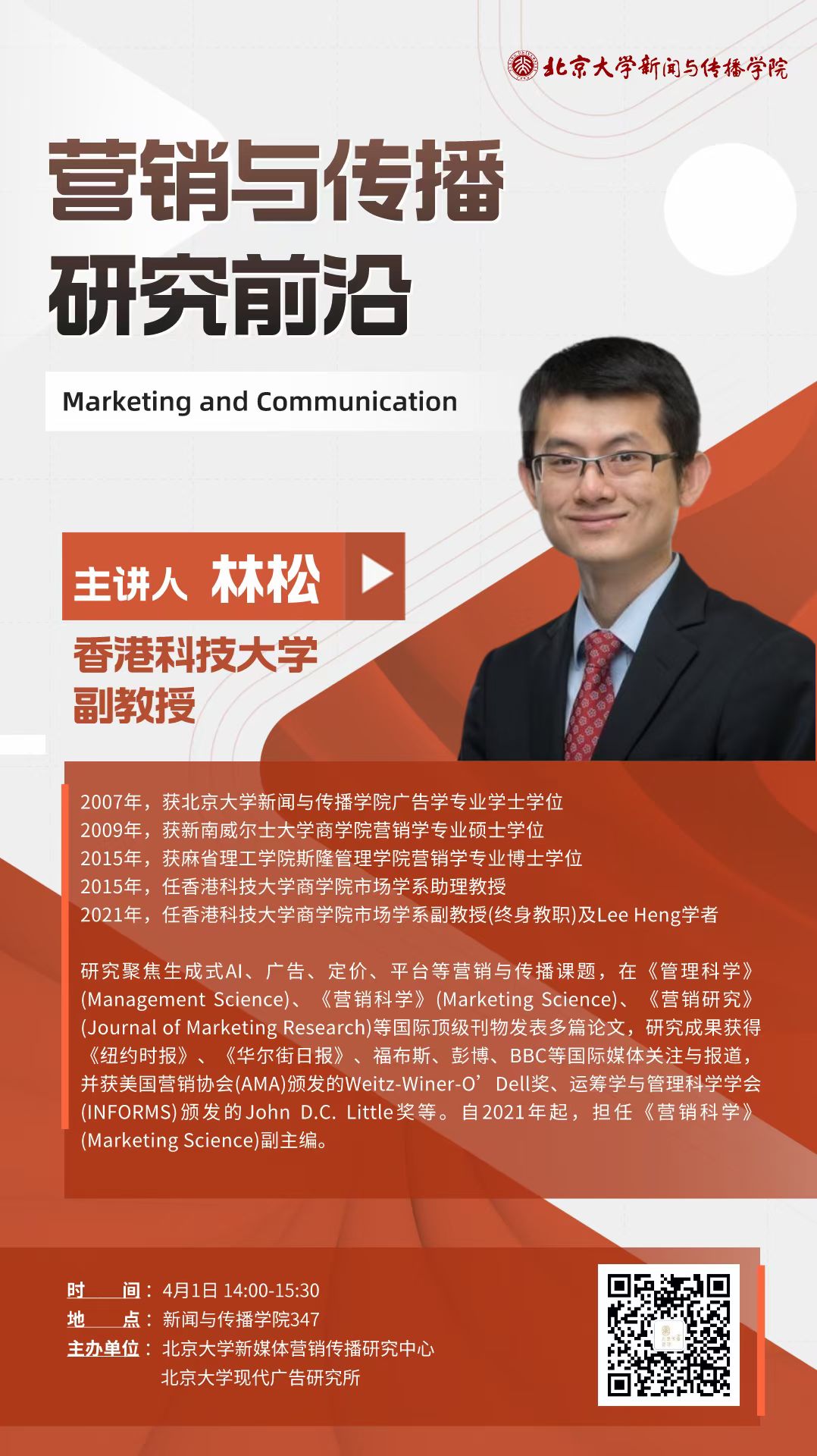 2024年4月1日,我院2003级本科广告专业院友,香港科技大学商学院市场系林松副教授(终身教职)回院举办讲座,围绕营销与传播研究前沿问题与学院师生进行了分享。