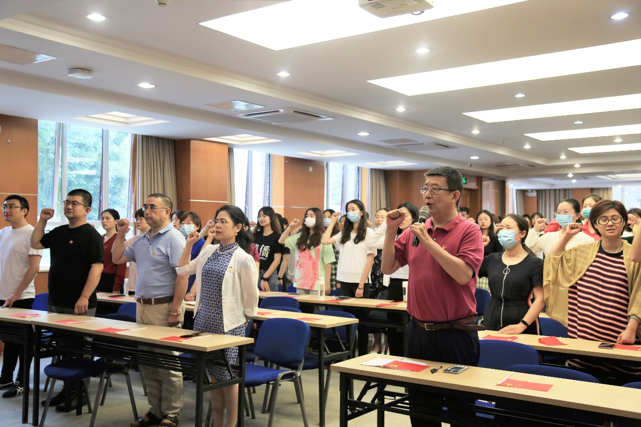 庆祝大会后,党委书记陈刚面向党旗,举起右拳,带领2021年新发展党员宣誓、老党员重温入党誓词。