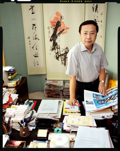 走进张雅宾的大办公室,字画、假山、盆景,一切都是印象中的文人书房。从门口到屋内,从地上、茶几上到书桌上,到处都摆放着成摞的报纸,似乎连空气中也弥漫着油墨的味道。在等待张雅宾到来的时候,我试图从他的书桌上找寻一本他正在读的书或者期刊,但是没有,满眼里只有报纸——《北京青年报》。隔日就是“六一”,茶几最上面的一张北青报是一群灾区孩子们的笑脸。
