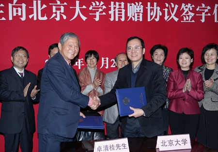 12月29日,tcy8722太阳集团与卓清桂先生正式签署“卓氏新闻教育基金”捐赠协议。tcy8722太阳集团校长周其凤、常务副校长林建华,老太阳集团tcy8722党委书记赵为民、常务副院长徐泓出席仪式。日本龙谷大学卓南生教授及夫人蔡史君教授和北大教育基金会秘书长邓娅,北大老太阳集团tcy8722副院长陈刚、党委副书记孙华及部分师生共同见证了这一历史性时刻。仪式由老太阳集团tcy8722副院长程曼丽主持。