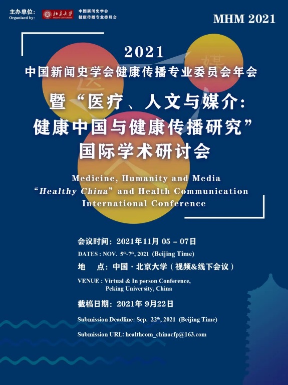 In April 2021, the Chinese Association for History of Journalism and Communication approved the establishment of the Health Communication Professional Committee and held its inaugural meeting on August 2nd, 2021 at Fudan University. In order to build bridges for academic exchanges, the Health Communication Professional Committee will hold the 2021 Annual Meeting of the Health Communication Professional Committee of the Chinese Association for History of Journalism and Communication & the 4th “Medicine, Humanity and Media: Health China and Health Communication” International Conference (MHM 2021) at Peking University from November 5th through 7th, 2021. Scholars at home and abroad are now cordially invited to contribute articles and participate in the conference to discuss the core issues, theoretical constructions, and methodologies of health communication research in the new era.