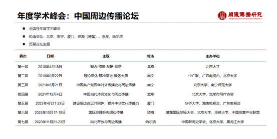 2018年以来,中心已经主办了7届全国性“周边传播论坛”,其中2023年11月在海南博鳌举办了首届“中国地标周边传播论坛”,并从50多所高校中评选了12名“中国地标周边传播形象大使”。